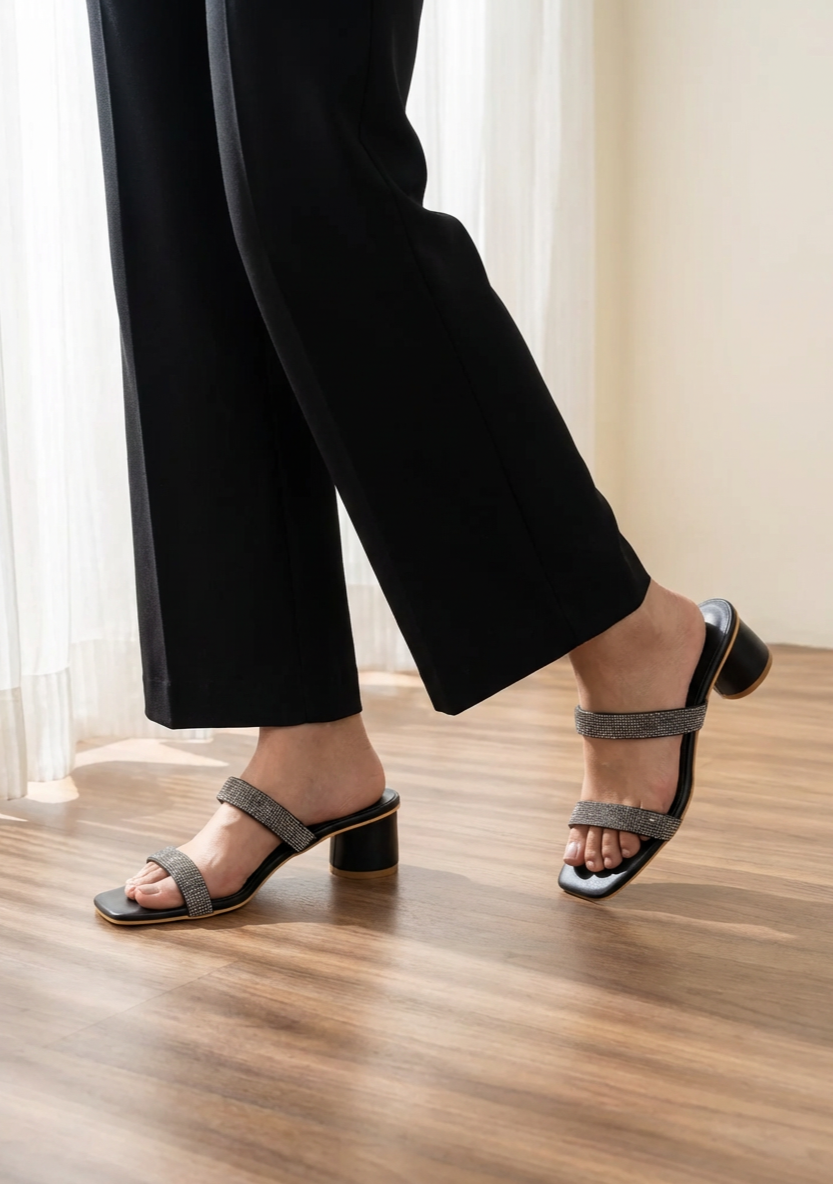 The Elara sandal radiates refined elegance with its modern, minimalist double-strap design. Its smooth, polished finish is elevated by intricately embellished straps that shimmer with understated glamour, making it perfect for both day and evening wear. With a block heel for stability and comfort, Elara adds a touch of sophistication to any outfit, whether it's a tailored suit or a breezy summer dress. The padded footbed ensures all-day wearability without compromising on style, while the subtle sparkle of the straps creates a chic, polished look that commands attention without overwhelming.